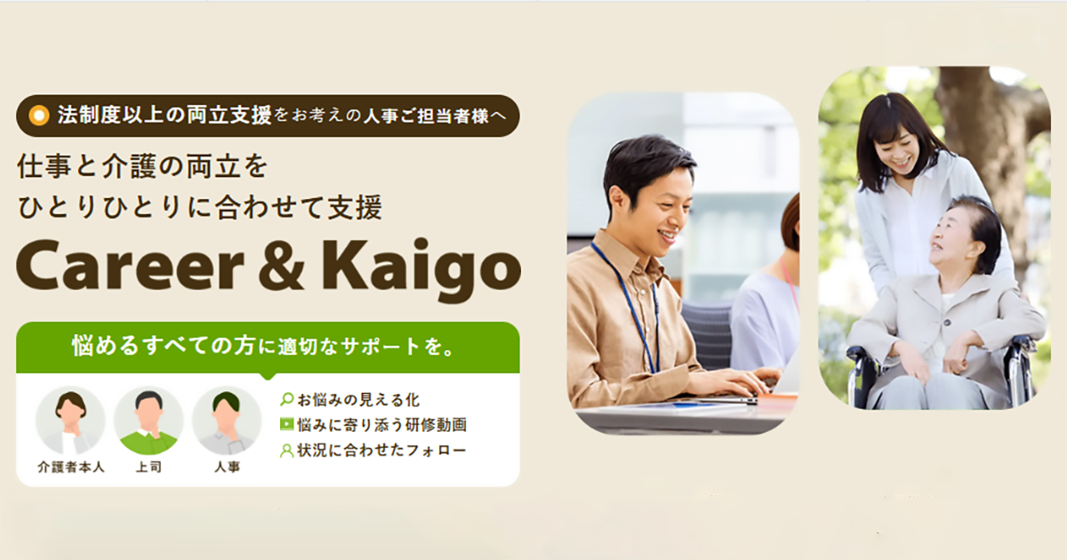 Career&Kaigo(キャリア&カイゴ)は、仕事と介護を両立する従業員一人ひとりの状況に合わせた支援を提供するサービスです。介護の準備期から両立期まで、負担の可視化やeラーニングによる個別のサポートを切れ目なく実施。管理職や人事のマネジメント負荷軽減にも貢献します。