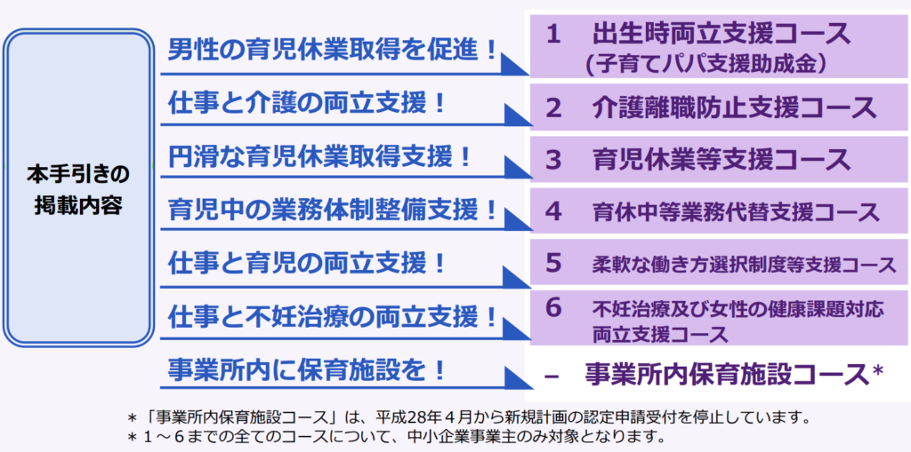そのため、令和7年度版で案内されている両立支援等助成金(1〜6コース)については、「中小企業事業主が対象」という原則を踏まえつつも、例外的な要件が設けられているコースがあることを理解したうえで、自社が支給対象となるかを手引き・支給要領で確認することが重要です。(各コースの詳細は次章「両立支援等助成金の主なコースと支給額(令和7年度版)」でも詳しく解説します。)
