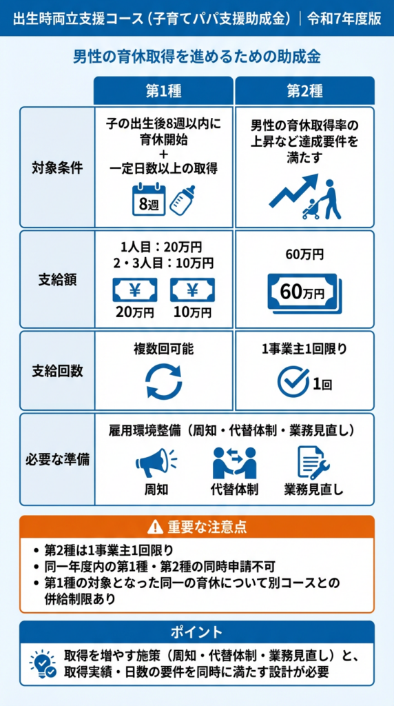 「同じ労働者」「同じ理由」で重複して受給できない場合があります。さらに、出生時両立支援コースでは、第2種の回数制限や、第1種との組み合わせの注意点など、コース内でもルールがあります。