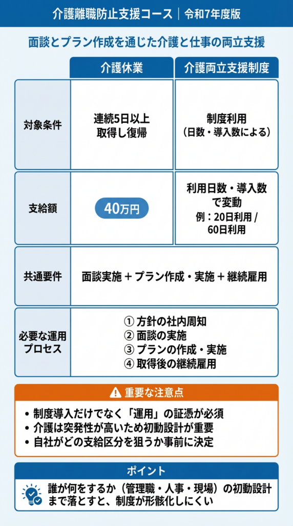 介護は急に始まることが多いので、申請のためだけではなく「誰が最初に動くのか(管理職・人事労務・現場)」まで決めておくと、制度が形だけになりにくくなります。