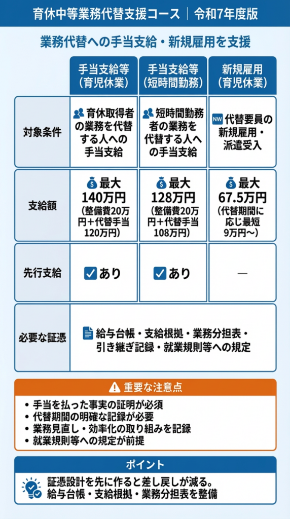 - 手当を支給するケース(育児休業の代替):最大140万円(業務体制整備費 最大20万円+業務代替手当 最大120万円。先行して支給される枠あり)