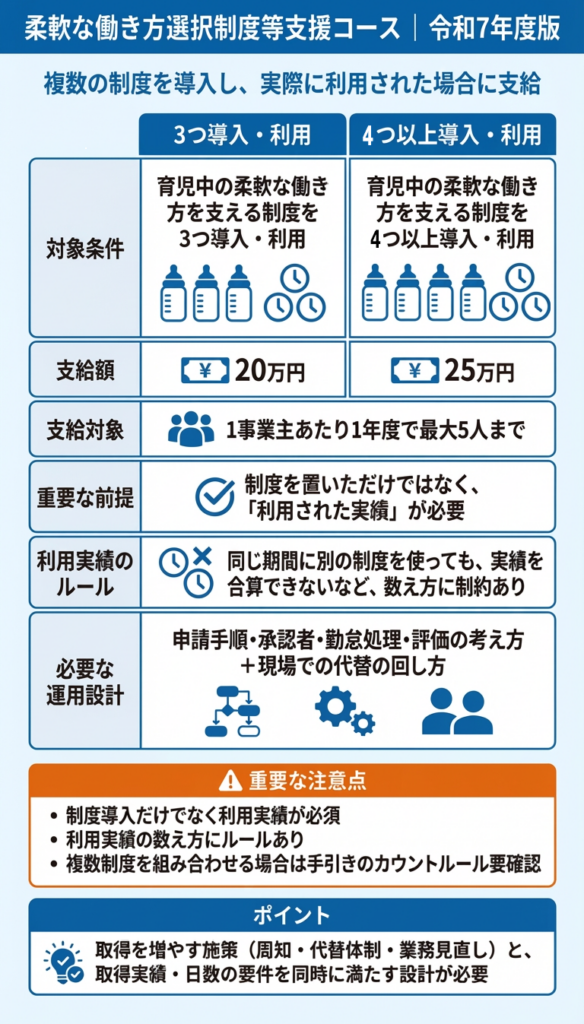 柔軟な働き方選択制度等支援コースは、2025年10月1日の改正により要件が変更されています。制度利用開始日等により適用される要件が異なる場合があるため、申請時は最新の手引き・支給要領で確認してください。