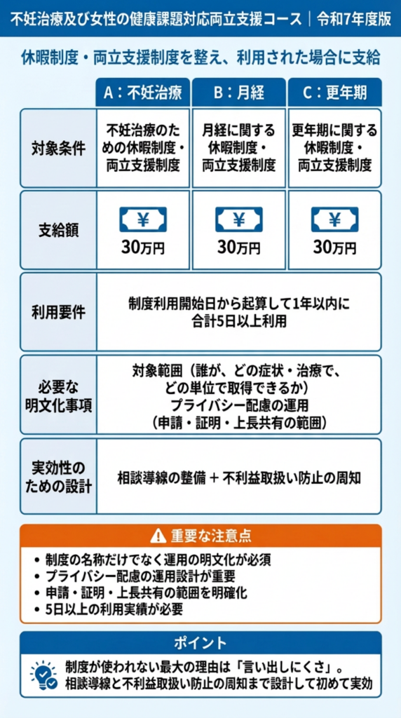 令和7年度の案内では、制度の利用を開始した日から数えて1年以内に、合計で5日以上利用があった場合に支給対象になります。区分は3つあり、A(不妊治療)30万円、B(月経)30万円、C(更年期)30万円という構成です。