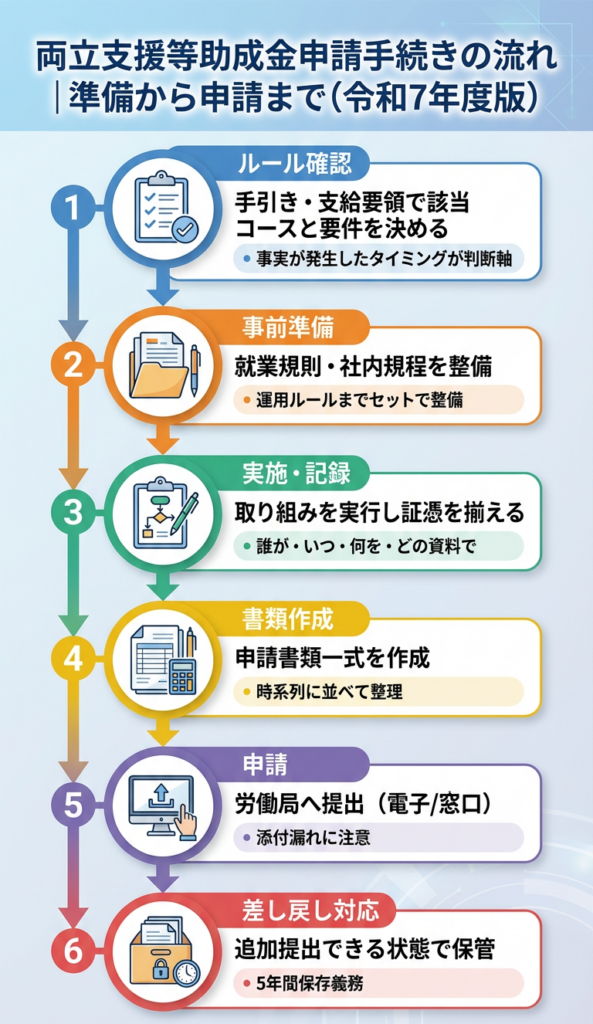 両立支援等助成金申請手続きの流れ|準備から申請まで